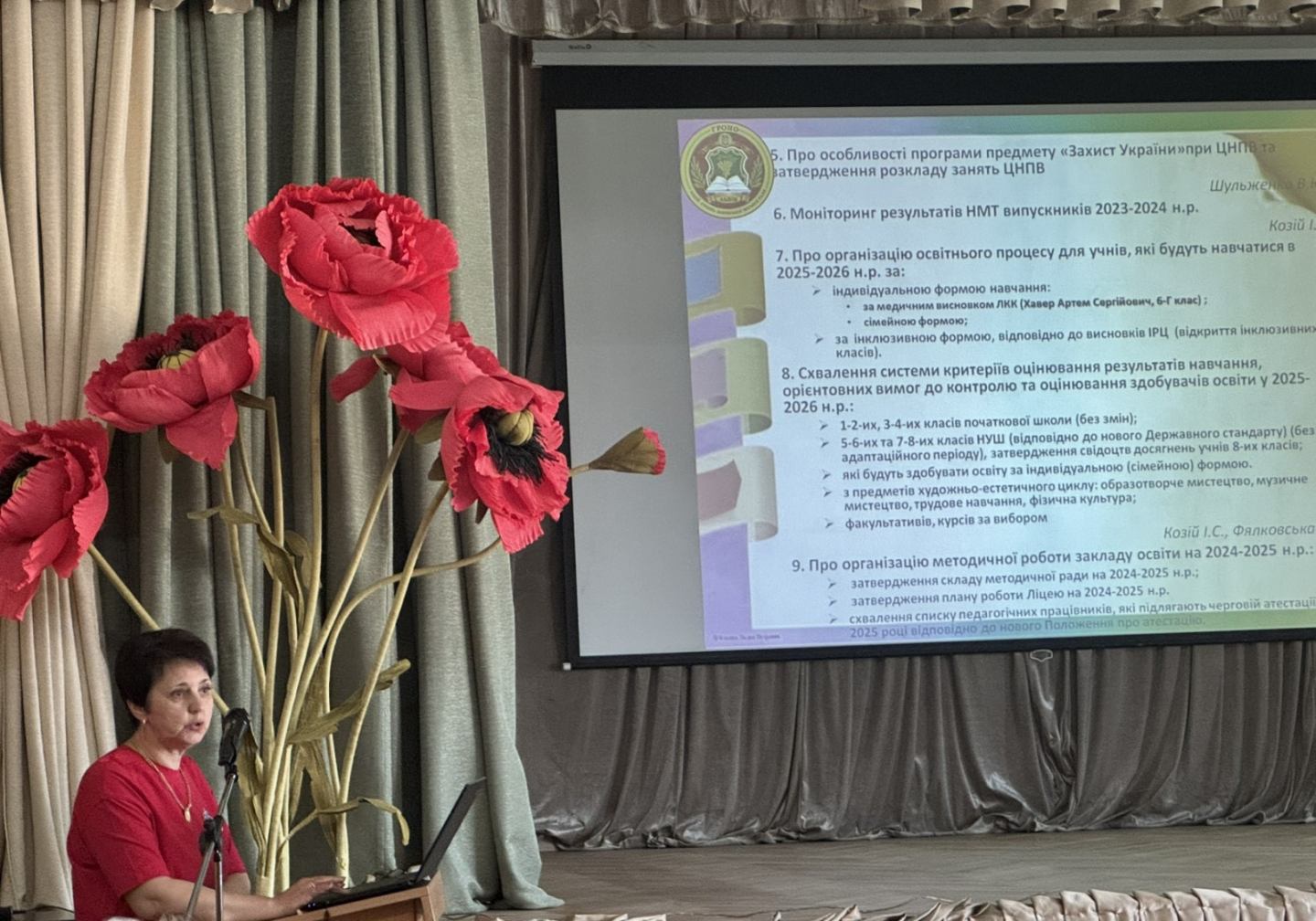 Зоряна У 29 серпня 2025 року в Ліцеї відбулося засідання педагогічної ради, де було розглянуто питання, пов’язані з початком нового 2025-2026 навчального року, зокрема затвердження річного плану роботи, освітньої програми, режиму роботи, а також обговорили особливості організації освітнього процесу, зокрема в умовах воєнного стану та впровадження Нової української школи.