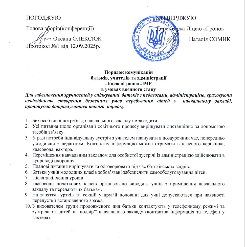 Витяг з протоколу загальних зборів про порядок комунікацій батьків, учнів, учителів та адміністрації Ліцею “Гроно” в умовах воєнного стану
